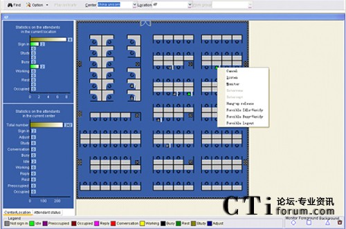 系統(tǒng)提供一整套管理工具,輔以圖形化的人性設(shè)計,將復雜的設(shè)備維護和系統(tǒng)優(yōu)化簡化為簡單的圖形管理,降低了維護難度和對維護人員的要求,提高了維護效率,使聯(lián)絡中心更為穩(wěn)定可靠地運行。座席地圖按真實座席位置展現(xiàn)座席狀態(tài),使業(yè)務代表服務質(zhì)量的監(jiān)控和檢查更為形象高效,有利于提升業(yè)務代表服務質(zhì)量。