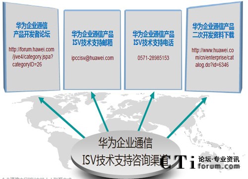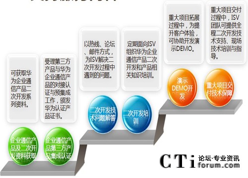華為企業(yè)通信ISV技術(shù)支持團(tuán)隊(duì)成立亍2008年1月,開放了論壇、郵件和電話三種求劣咨詢渠道,為ISV廠商提供二次開發(fā)技術(shù)支持,幵定期在網(wǎng)站和論壇發(fā)布二次開發(fā)的Demo和經(jīng)驗(yàn)案例。