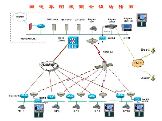 整個(gè)視頻會(huì)議系統(tǒng)是基于H.323,集團(tuán)本部中心放置9個(gè)視頻終端,其中包括2臺大型會(huì)議終端VS4000,2臺ViewStation FX,5臺ViewStation 128,集團(tuán)下屬60個(gè)電廠均采用視頻終端ViewStation 128。整個(gè)網(wǎng)絡(luò)采用Polycom MCU的混速功能,在本部中心采用768Kbps進(jìn)行視頻傳輸,和下屬60個(gè)電廠及分公司采用128Kbps進(jìn)行傳輸。由于網(wǎng)絡(luò)傳輸線路分為衛(wèi)星線路和地面有線網(wǎng)絡(luò),衛(wèi)星線路帶寬為768Kbps-1Mbps,用于業(yè)務(wù)下行線路,地面有線網(wǎng)絡(luò)128Kbps用于視頻回傳。根據(jù)網(wǎng)絡(luò)傳輸線路的實(shí)際情況,在本部中心利用1臺視頻終端將其模擬信號(AV信號)送到衛(wèi)星端接設(shè)備(包含MODEM,編解碼器等),將模擬信號轉(zhuǎn)換成數(shù)字信號(MPEG4),利用768K-1Mbps衛(wèi)星線路廣播到每個(gè)接收點(diǎn),通過每個(gè)接收點(diǎn)的編解碼器將數(shù)字信號轉(zhuǎn)換成模擬信號連接到顯示終端(如TV、顯示器)上進(jìn)行收看,通過這種方式可以實(shí)現(xiàn)利用衛(wèi)星線路的高帶寬,并利用其廣播特性,節(jié)省投資。