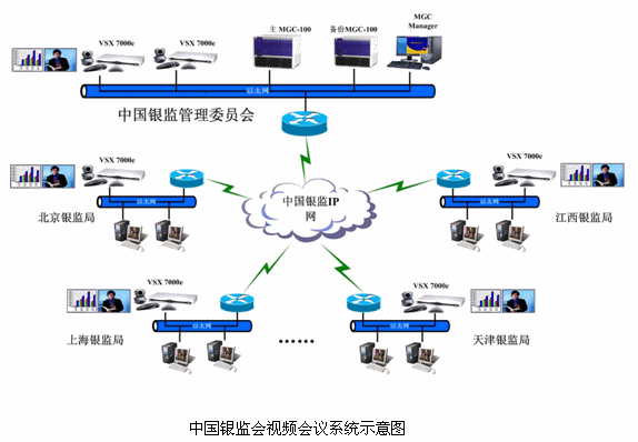 中國銀監(jiān)會目前已經(jīng)擁有一個高速、高可靠性的ATM骨干傳輸網(wǎng)絡(luò),網(wǎng)絡(luò)采用星形結(jié)構(gòu),各分支機(jī)構(gòu)到北京總部的線路均為2條15M ATM線路,這種優(yōu)良的網(wǎng)絡(luò)非常適合視頻會議業(yè)務(wù)的運(yùn)營。視頻會議網(wǎng)建立完成后可以實現(xiàn)通過遠(yuǎn)程視頻會議,遠(yuǎn)程處理重點銀行業(yè)金融機(jī)構(gòu)監(jiān)事會的日常管理工作;遠(yuǎn)程審查銀行業(yè)金融機(jī)構(gòu)高級管理人員任職資格;遠(yuǎn)程討論協(xié)商制定有關(guān)銀行業(yè)金融機(jī)構(gòu)監(jiān)管的規(guī)章制度和辦法;遠(yuǎn)程對銀行業(yè)金融機(jī)構(gòu)實監(jiān)管,依法對違法違規(guī)行為進(jìn)行查處;更加可以通過遠(yuǎn)程雙流會議,按照國家有關(guān)規(guī)定,遠(yuǎn)程公布全國銀行數(shù)據(jù)、報表。