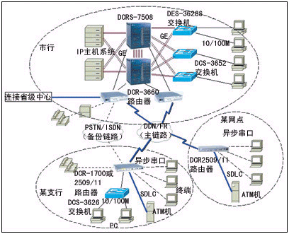 對于業(yè)務比較少的網(wǎng)點,使用DCR-2501或DCR-2509路由器;對于業(yè)務比較多的網(wǎng)點,使用DCR-2511或DCR-1720或DCR-1750路由器。營業(yè)網(wǎng)點使用DCR-2500或1700系列路由器,既實現(xiàn)柜員終端、IP業(yè)務等綜合業(yè)務接入,又能用以太口將辦公網(wǎng)絡連接起來,實現(xiàn)真正的綜合業(yè)務接入。原有遠程終端可以直接連在DCR-2500或1700系列路由器上,通過IP網(wǎng)絡訪問網(wǎng)絡內(nèi)任意位置的業(yè)務前置機,無須改動原有業(yè)務軟件,輕松實現(xiàn)銀行綜合業(yè)務。終端通過上述路由器可訪問支行和分行不同局域網(wǎng)上的多臺前置機,訪問時,不需要調(diào)用前置機的TELNET服務,且終端號固定。