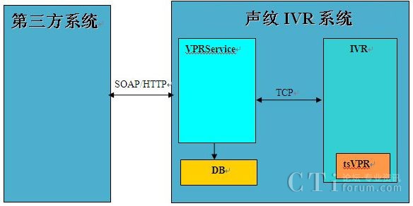 本系統(tǒng)主要由三部分組成:VPRService、IVR、tsVPR,其中VPRService的功能是負(fù)責(zé)跟外部其它系統(tǒng)(第三方軟件)交互和資料的管理;IVR的功能主要是負(fù)責(zé)系統(tǒng)業(yè)務(wù)流程;tsVPR是天聰聲紋識別引擎,負(fù)責(zé)聲紋登記和聲紋識別。