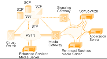 在PSTN網(wǎng),交換機組、SCP(Service Connection Points)和媒體服務器協(xié)同工作,為用戶提供服務。在包交換網(wǎng)絡環(huán)境,這種服務由軟件交換機(Softswiches)、媒體服務器和應用服務器協(xié)同提供。連接這兩種網(wǎng)絡的橋梁是媒體網(wǎng)關和信令網(wǎng)關。值得注意的是,包交換中的部件都是邏輯點,其多個部件可能僅僅由網(wǎng)絡中的一個應用硬件平臺提供。例如:一個基于網(wǎng)絡提供語音識別功能的語音郵件系統(tǒng)可能包括如下模塊: