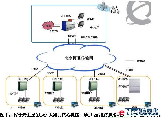 新的網(wǎng)絡(luò)建成以遠大路中心機房為核心的星形網(wǎng)絡(luò),租用北京網(wǎng)通2M專線的方式同各個門市店連接。各個門市店設(shè)立了自己的程控交換機,并通過E1中繼方式和核心機房實現(xiàn)全網(wǎng)互聯(lián)。在此方案中,所有的市話呼入和呼出都通過核心節(jié)點同網(wǎng)通之間的中繼通道,從而實現(xiàn)大中電器內(nèi)部話音通訊的統(tǒng)一編號方案、統(tǒng)一撥號規(guī)則、統(tǒng)一維護和管理;并對外公布公開和便于記憶的號碼,以配合網(wǎng)點的促銷活動,以及未來客戶服務(wù)等應(yīng)用的擴展。