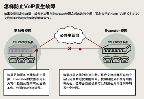 美國西北大學(xué)原來的兩臺運(yùn)營商級SL-100電話交換機(jī)(一臺安裝在芝加哥校園,一臺安裝在Evanston校園)已經(jīng)用了差不多20年。升級的目標(biāo)是將兩臺獨(dú)立的交換機(jī)合并為一臺邏輯交換機(jī)來減少管理復(fù)雜性。同時(shí),不必更換全部數(shù)字電話。最終他們決定升級到同時(shí)支持VoIP和TDM的Nortel CS 2100 VoIP,這樣用戶不用被迫把他們的電話換為VoIP電話。Carr說:“不管是那些希望利用VoIP性能的用戶,還是想繼續(xù)使用當(dāng)前電話特性和服務(wù)的用戶,可以各取所需!