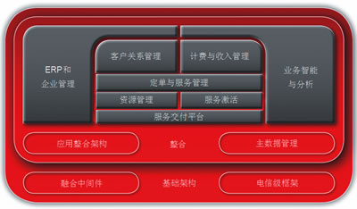 在橫向分層的系統(tǒng)架構(gòu)(如流程、資源、激活等)下,Oracle融合OSS解決方案更加強(qiáng)調(diào)層與層之間有效的集成,并全球首家推出了基于SOA架構(gòu)的電信行業(yè)的端到端集成應(yīng)用套件(OracleApplicationintegrationArchitecture, AIA)。Oracle AIA預(yù)建的SOA架構(gòu)提供靈活的框架,支持新的業(yè)務(wù)需求和持續(xù)的創(chuàng)新,并通過(guò)預(yù)建的跨系統(tǒng)流程模板有效進(jìn)行跨系統(tǒng)的集成。