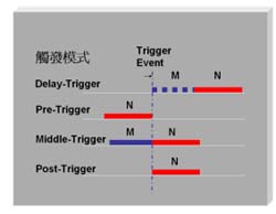 、中間觸發(fā)(middle-trigger)及后觸發(fā)(post-trigger)。其觸發(fā)點與所采集到數據的關系如下圖所示: