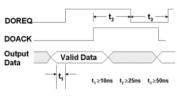 mode),相較于序列式的數據傳輸,并行傳輸提供了簡單且更高速的數據傳輸方式,不過其技術關鍵在于發(fā)送端與接收端之間的時序差問題,因此,針對此時序差的問題,高速數字I/O卡需提供握手模式,讓兩張卡以交握信號確保數據的正確性。下圖為數據輸出的時序圖: