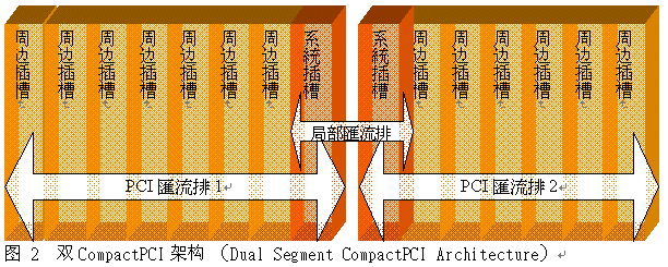 PICMG 2.0 CompactPCI系統(tǒng)是由一組或多組CompactPCI 總線所組成,每個總線最多可達(dá)8個CompactPCI板卡插槽,其中包含一個系統(tǒng)插槽(system slot)與最多達(dá)7個外圍插槽(peripheral slot)。PCI總線是作為該總線內(nèi)插槽之間的主要通訊途徑,在這個架構(gòu)下,PCI總線與系統(tǒng)插槽是一個可能的故障單點,故障的周邊插槽會讓整個PCI總線停止作用而阻礙了其它任一插槽之間的通訊。這種故障單點成為CompactPCI采用高可靠度應(yīng)用的一個主要障礙,早期的CompactPCI 高可靠度系統(tǒng)架構(gòu)必須克服PCI總線單點故障的限制,典型的解決方法則是添加第二個CompactPCI 總線且讓此二個總線的功能相同。圖2顯示雙CompactPCI 總線架構(gòu)的范例。