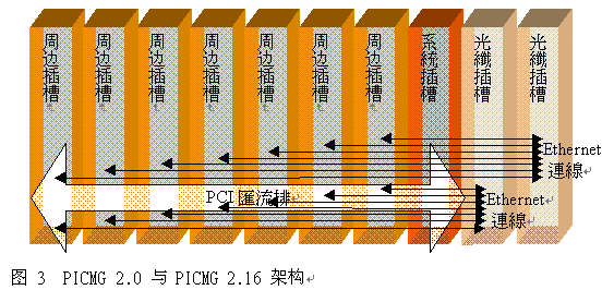 在2001年9月,PICMG協(xié)會核準(zhǔn)PICMG 2.16 封包交換背板(Packet Switched Backplane)規(guī)格,本規(guī)格對于在一個CompactPCI架構(gòu)里外圍插槽(peripheral slots)與光纖插槽(fabric slots)之間10/100/1000Mbit Ethernet的互聯(lián)做了詳細(xì)定義。光纖插槽是相互備援的,PICMG2.16兼容系統(tǒng)已被廣泛應(yīng)用于多種用途上,Ethernet互聯(lián)與IP數(shù)據(jù)傳輸需求的普遍特性促使系統(tǒng)提供者廣泛采用此規(guī)格。圖3顯示典型的PICMG2.0與2.16架構(gòu)。