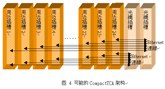 高可靠度CompactPCI 系統(tǒng)的下一步發(fā)展將是去除系統(tǒng)插槽(system slot);因為應(yīng)用程序利用現(xiàn)今系統(tǒng)的IP互聯(lián),PCI總線逐漸成為派不上用場的費(fèi)用。PICMG協(xié)會現(xiàn)正進(jìn)行CompactTCA的規(guī)格制訂,CompactTCA規(guī)格可望結(jié)合AdvancedTCA(PICMG 3.0)所定義的系統(tǒng)管理能力、PICMG 2.0所定義的標(biāo)準(zhǔn)機(jī)箱(Form Factor)及PICMG 2.16所定義的數(shù)據(jù)傳輸。這種架構(gòu)將不包含PCI總線,在此架構(gòu)下的系統(tǒng)將能夠支持24個外圍插槽與2個光纖插槽。摒除PCI總線將可降低CompactPCI 系統(tǒng)所使用的電路板成本、降低提供備援系統(tǒng)插槽(system slot)的復(fù)雜性,以及增加插槽總數(shù)。圖4顯示可能的CompactTCA系統(tǒng)范例。