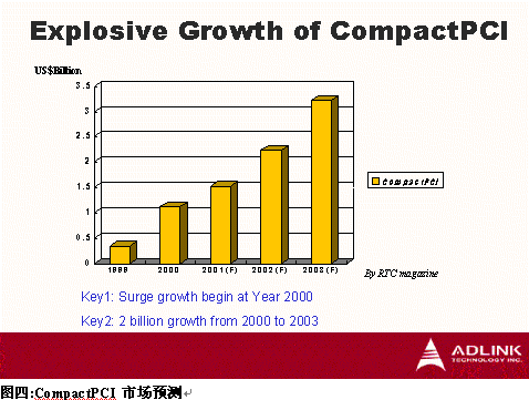 建立在開放,可程序化(Programmable)的高可用性CompactPCI結(jié)構(gòu)已成為新一代電信網(wǎng)絡(luò)建設(shè)的核心,設(shè)備供貨商及服務(wù)供貨商對(duì)這整種解決方案的需求日益殷切,標(biāo)準(zhǔn)的發(fā)展使開發(fā)商的產(chǎn)品都與CompactPCI開放式平臺(tái)兼容,設(shè)備供貨商及服務(wù)供貨商可以在廣泛的產(chǎn)品中選擇,并享受競爭開放市場帶來的低成本優(yōu)勢(shì),彈性與快速上市多重優(yōu)勢(shì)。如圖四,依據(jù)RTC Magazine 估計(jì),CompactPCI市場將由1999年的美金$350 Million成長到2003年的美金$3200 Million,年復(fù)合成長率高達(dá)45.6%,其中又以2002年至2003年最大幅成長。CompactPCI為工業(yè)計(jì)算機(jī)產(chǎn)業(yè)開拓了一個(gè)以往傳統(tǒng)工業(yè)計(jì)算機(jī)無法應(yīng)用的新市場,而CompactPCI需針對(duì)電信等級(jí)應(yīng)用提供高可靠度及達(dá)到嚴(yán)苛高品質(zhì)要求,卻又為傳統(tǒng)工業(yè)計(jì)算機(jī)廠商豎立高進(jìn)入障礙,因此,目前能提供電信級(jí)CompactPCI寬頻通訊平臺(tái)幾為國外廠商,如Motorola、Ziatech、Force Computer等,而亞洲目前則有凌華(ADLINK TECHNOLOGY INC.)為CompactPCI領(lǐng)導(dǎo)廠商。設(shè)備供貨商及服務(wù)供貨商在選擇CompactPCI寬頻通信平臺(tái)供貨商時(shí),除了需具備堅(jiān)強(qiáng)研發(fā)能力,高品質(zhì)的制造能力(如6 sigma、世界級(jí)通訊大廠認(rèn)證等)、是否能快速提供滿足客制化需求的產(chǎn)品更是關(guān)鍵,畢竟沒有一家供貨商能接受提供客戶完全沒有差異化的產(chǎn)品。CompactPCI寬頻通訊平臺(tái)帶來的劃世紀(jì)通訊革命將是新一代電信網(wǎng)絡(luò)設(shè)備應(yīng)商及運(yùn)營商的最佳選擇。