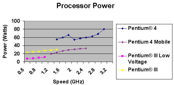 在CompactPCI演進的歷史軌跡中,x86處理器已經(jīng)經(jīng)歷過非常顯著的變化。有些非常早期的卡板用的是66MHz的CPU,目前這一代的x86產(chǎn)品,包含了1.7GHz Mobile Pentium 4 CPU。在嵌入式工業(yè)對支持長生命周期的產(chǎn)品需求,造成了產(chǎn)品制造廠在處理器的選擇上,傾向從嵌入式或有長周期支持的產(chǎn)品線去選擇。這些產(chǎn)品并不像桌上型計算機或服務器的處理器那樣走得那么先端,這些產(chǎn)品的生命周期是用年而不是用月來計算的。此外,這個產(chǎn)業(yè)也藉由使用mobile processor而取得一些優(yōu)勢,這種處理器在電源供應的需求上和嵌入式以及電信領域的應用非常類似。下圖提供了Pentium各系列的處理器與其功率消耗的一個關連性,可以看到Pentium III與Mobile Pentium 4處理器家族的產(chǎn)品符合了今日CompactPCI板卡對處理器所提供的30Watts功率規(guī)格。