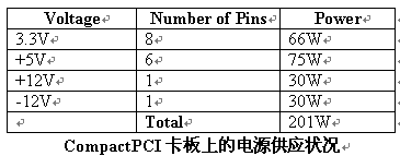 CompactPCI卡板透過J1/J2的連接器來接收電源。有8個3.3V、6個5V、1個+12V、1個-12V的電源接腳。這些接腳供應1安培 IEC61076-4-101規(guī)格的電。每個接腳一安培的限制是保守的,而且某種程度上會誤導讓人以為所有的接腳可以在周邊溫度70°C的狀況下去接一安培的電流。在現(xiàn)實狀況中并不是所有連接器中的接腳都負載到最大的電流量,事實上大部分的CompactPCI接腳都是負載在以毫安為單位的電流范圍中。70°C一安培的限制,是基于流過接腳的電流所產(chǎn)生的熱。當電流增加時,也加大了跨過接腳的電位差。產(chǎn)生的熱是一種電壓和電流的函數(shù),電壓和電流的增加會使連接器接腳的溫度上升。在CompactPCI中有最顯著電流量的的接腳,是電源供應器接腳。如果設計者假設J1/J2連接器中的其它所有接腳都有電流負載,每一個接腳的最大電流則會是在40°C 2.5Amps, 這個信息可以在IEC61076-4-101的規(guī)格中的4.2.3中被找到。在每個接腳2.5安培的條件下,板卡可取得的功率大小如下表所示,此表顯示出卡板的設計者最多可以從J1/J2連接器中拉出200Watts的電。