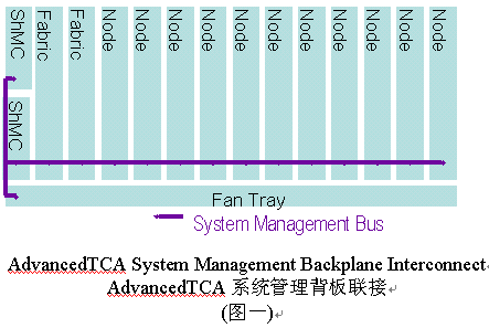 管理系統的信息傳輸和IPMI(智能平臺管理接口)指令集被用作對ATCA框架的管理,包括對電源的管理、電子鑰匙和機架內溫度的監(jiān)控。系統管理是通過機框管理控制器(ShMC)執(zhí)行的。機框管理控制器(ShMC)負責完成對ACTA系統中的現場置換單元(Field Replaceable Units, FRU) 如 單板,電源、風扇、溫度傳感器的管理。ShMC能夠讀取當前FRU的狀態(tài)也可以命令FRU進入不同的電源狀態(tài)。舉個例子,如果ShMC觀測到機框內溫度發(fā)生躍升,它就可能控制風扇提高轉速;ShMC同樣負責對ATCA機架內電源的管理,如果電源開始對ACTA 單板進行供電,單板唯一可以運行的部分是系統管理,ShMC決定單板那些可以全部啟動以及何時啟動。系統管理架構的實體承載是基于I2C 接口的IPMB(智能平臺管理總線)。I2C是一條具備數據和時鐘的雙串行信號線, I2C總線使用100Khz時鐘和3.3V信號。ATCA規(guī)范制定要求2個IPMB總線,分別冠以IPMB-A和IPMB-B,兩條總線合一稱之為IPMB-0。IPMB可以以雙總線或雙星型配置方式實現。之所以要求雙IPMB總線是為了保證系統管理子系統的可靠性。IPMB總線被用作聯接ShMC與ATCA單板和ATCA機架中FRUs的橋梁。雙IPMB總線可同時被使用以加倍傳輸頻寬,但設計者必須考慮萬一其中一條IPMB總線失靈所帶來的沖擊。典型的ATCA背板上系統管理間的互聯如下圖所示,在背板上有兩個ShMC槽位,兩個交換槽位,11個節(jié)點槽位和1個風扇的連接。值得說明的是管理總線與所有的節(jié)點槽、交換槽通過一對雙備援的ShMC聯接。