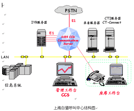 隨著企業(yè)間相互競爭的加劇,用戶對企業(yè)服務要求的提高,越來越多的企業(yè)承諾為用戶提供一個24小時的客戶服務環(huán)境,用戶可以隨時獲得聲音、文字、文件等服務。而呼叫中心可為企業(yè)解決這些問題。阿爾卡特作為著名的企業(yè)通信產(chǎn)品供應商,可以為企業(yè)提供一套完整的多媒體呼叫中心平臺解決方案。上海白貓有限公司是國內(nèi)著名的洗滌系列產(chǎn)品供應商,提供多種渠道為分銷商和用戶提供產(chǎn)品和服務。面對競爭對手,面對客戶的要求,上海白貓決定建設(shè)電子商務平臺,通過電話、傳真、郵件、網(wǎng)站各種接入手段,結(jié)合公司的物流系統(tǒng),倉庫管理,網(wǎng)站系統(tǒng),建立客戶關(guān)系管理,經(jīng)營策略分析。從而鞏固其在同行業(yè)的地位,獲得更大的競爭力。阿爾卡特為上海白貓有限公司提供OmniPCX 4400交換機解決方案。采用CCD排隊軟件,采用CCS呼叫管理軟件。CTI中間件采用CT-Connect。