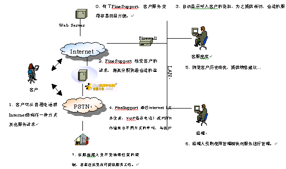 FineSupportTM網(wǎng)通呼叫中心解決方案主要由以下幾個部分組成:Media Gateway(接受來自IP網(wǎng)的網(wǎng)絡(luò)電話、傳統(tǒng)電話等呼叫,傳送給軟交換系統(tǒng))、Service Switch(軟交換系統(tǒng),負責(zé)呼叫控制)、IP IVR(存儲顧客呼叫信息,播放語音提示信息)、Soft ACD(呼叫分配服務(wù)器,可定制多種分配策略)、Web Server(負責(zé)報表管理、站點管理和監(jiān)控、FAQ存儲管理、留言及文本交談管理等)、Chat Server(建立交談通道)、Remote Agent(坐席工作站。通過客戶端軟件進行客服支持)。
