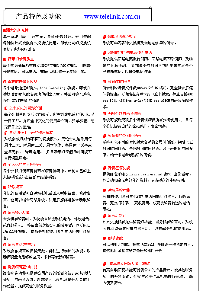 系統(tǒng)可提供直撥分機,呼叫器,電話,移動電話或點留言燈的方式通知分機主人有留言,聽完留言即滅燈