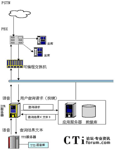 用戶撥打統(tǒng)一特服號碼進入客戶服務系統(tǒng),經(jīng)過自動語音系統(tǒng)提示,選擇公共信息查詢項目。用戶可以通過電話提交他的查詢請求(比如使用按鍵方式),IVR服務器收到請求后會向其他應用服務器提交此查詢請求,當IVR得到查詢結果后,他會將文本形式的查詢結果交給jTTS服務器,jTTS服務器會返回查詢結果的語音形式,最終語音會在坐席上播放,用戶就可以聽到他剛才所要查詢的信息。