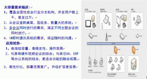 龐大的組織機構和成千上萬的工作人員的數量,使工作信息經過層層的傳達周轉,一個文件和制度落實到最基層,往往要十天半個月。而大中型的組織機構往往對日常溝通協作、培訓、會議、統(tǒng)一調度需求非常頻繁,傳統(tǒng)的溝通協作模式耗費大量人力物力和時間,不僅使溝通速度隨之降慢、效率放緩,更使組織機構的會議培訓和差旅費用成本成為企業(yè)節(jié)能增效的阻礙。而傳統(tǒng)電話會議和硬件視頻會議產品因其高投入、難維護的缺陷比使人們越來越傾向于選擇大容量、高穩(wěn)定性、協同性強、高性價比的軟件視頻會議系統(tǒng)。