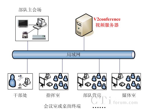 V2視頻會(huì)議系統(tǒng)建立在森警部隊(duì)專網(wǎng)的基礎(chǔ)上,各區(qū)作戰(zhàn)部隊(duì)會(huì)議室、指揮室和部隊(duì)營房會(huì)議均為光纖100M接入,每個(gè)中隊(duì)官兵營房都集中建立了培訓(xùn)會(huì)議室,負(fù)責(zé)日常新兵的培訓(xùn)教育。在現(xiàn)有的網(wǎng)絡(luò)基礎(chǔ)上構(gòu)建了V2視頻會(huì)議系統(tǒng),來滿足各個(gè)中隊(duì)和教導(dǎo)大隊(duì)的網(wǎng)絡(luò)會(huì)議和培訓(xùn)需求。在每個(gè)節(jié)點(diǎn)會(huì)議室部署了電視、攝像頭和相關(guān)音響設(shè)備,目前已經(jīng)建成10多個(gè)網(wǎng)絡(luò)會(huì)議節(jié)點(diǎn)的遠(yuǎn)程視頻培訓(xùn)系統(tǒng)。