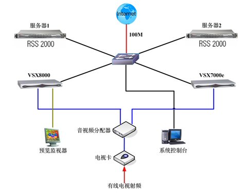應急備份:此系統(tǒng)中服務器1和服務器2互為備份;VSX8000和VSX7000e互為備份。RSS2000分配公網IP以便用戶通過互聯網接收直播和點播,兩臺服務器的地址同時發(fā)布在網站上。