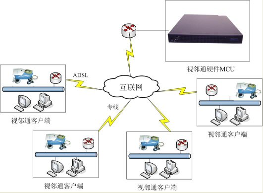 視鄰?fù)ㄏ到y(tǒng)采用軟硬結(jié)合的解決方案思想進(jìn)行設(shè)計(jì),主要組成是一個(gè)MCU,依據(jù)點(diǎn)數(shù)配備軟件終端,軟件終端含一個(gè)帶云臺(tái)可遠(yuǎn)程遙控的攝像頭,以及一個(gè)自帶回音消除的全向麥與小音箱。和傳統(tǒng)323產(chǎn)品比較,部署簡單,靈活,在互聯(lián)網(wǎng)表現(xiàn)效果良好,并具備強(qiáng)大的數(shù)據(jù)功能,同時(shí)價(jià)格更具競爭力,而純軟視頻會(huì)議系統(tǒng)相比,則在穩(wěn)定性,清晰度上更勝一籌。