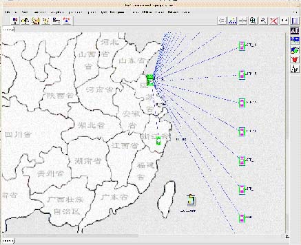 ●網(wǎng)絡(luò)結(jié)構(gòu)和網(wǎng)絡(luò)狀態(tài)總覽:按照網(wǎng)元地理位置提供直觀的網(wǎng)絡(luò)視圖,并通過(guò)顏色的變化和圖標(biāo)的閃爍表示網(wǎng)元的運(yùn)行狀態(tài)和鏈路的負(fù)荷狀況;