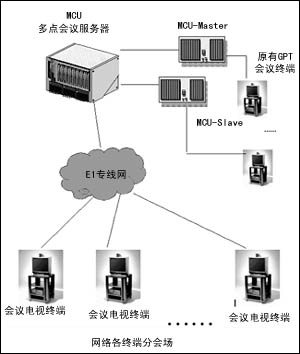 根據(jù)用戶的需求,包括擴(kuò)容建設(shè)26個(gè)點(diǎn)的會(huì)議電視系統(tǒng),網(wǎng)絡(luò)環(huán)境為DDN專線E1(2Mbps)方式等,并經(jīng)過(guò)嚴(yán)格招標(biāo)、測(cè)試和反復(fù)論證,該系統(tǒng)采用了VTEL美國(guó)視訊公司的會(huì)議室型終端產(chǎn)品銀河(Galaxy)755,以及多點(diǎn)會(huì)議服務(wù)器(MCU)。