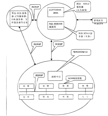 系統(tǒng)采用總部集中模式,前臺(tái)運(yùn)行信雅達(dá)通訊轉(zhuǎn)接程序(CCPTOBMS)和信雅達(dá)業(yè)務(wù)處理程序(BMS)。通訊轉(zhuǎn)接程序從華為接入平臺(tái)接收各類業(yè)務(wù)請(qǐng)求,再轉(zhuǎn)發(fā)至業(yè)務(wù)處理程序。業(yè)務(wù)處理程序與新利處理中心通訊,將各類業(yè)務(wù)請(qǐng)求分類處理。后臺(tái)數(shù)據(jù)庫選用兩臺(tái)服務(wù)器安裝SQLSERVER7.0,使用OCTOPUS進(jìn)行數(shù)據(jù)備份。