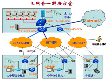 中興通訊具有豐富的數(shù)據(jù)、視訊、語音網(wǎng)關(guān)等設(shè)備,能提供端到端的語音、數(shù)據(jù)、視訊三網(wǎng)合一解決方案。企業(yè)內(nèi)部電話/視訊長途走自己的數(shù)據(jù)網(wǎng),節(jié)約費用;組成語音VPN/視訊 VPN,多種手段保證Qos。