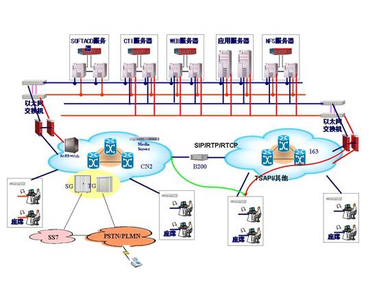 客戶座席可以分布在不同的地點(diǎn),集中在電信機(jī)房的座席可以直接部署到CN2網(wǎng)上,分布在客戶處的座席,可以部署在各地市專網(wǎng)上或者163城域網(wǎng)上。部署在163網(wǎng)和專網(wǎng)上的座席,語(yǔ)音流和SIP協(xié)議通過寬帶接入網(wǎng)關(guān)