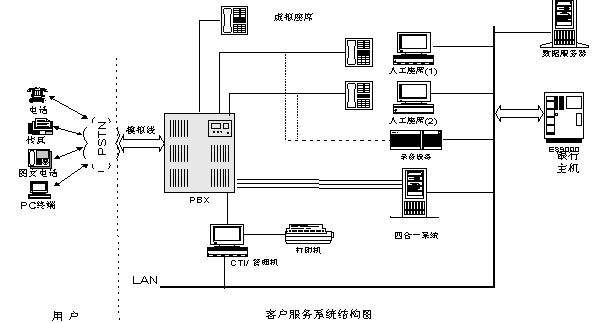 銀行客戶撥入銀行客戶服務(wù)中心系統(tǒng)后,首先聽(tīng)到歡迎詞“歡迎進(jìn)入客戶服務(wù)中心系統(tǒng),按1對(duì)公查詢,按2儲(chǔ)蓄查詢,按3信用卡查詢,按4金融信息查詢,按5人工服務(wù)”,如果客戶選擇語(yǔ)音、傳真自動(dòng)服務(wù),則進(jìn)入IVR系統(tǒng),客戶可以按照語(yǔ)音提示進(jìn)行選擇,獲得相應(yīng)自動(dòng)服務(wù),如果用戶選擇人工服務(wù),則進(jìn)入人工服務(wù)系統(tǒng),由銀行業(yè)務(wù)人員提供相應(yīng)人工服務(wù)。如果用戶使用金融圖文電話或終端進(jìn)入銀行客戶服務(wù)中心,則系統(tǒng)自動(dòng)轉(zhuǎn)到IVR系統(tǒng)中的MODEM,提供相應(yīng)遠(yuǎn)程查詢服務(wù)。