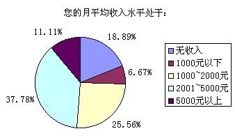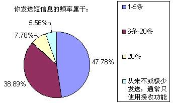 以上選擇中,選擇答案A~E的被訪者比例分別為18.89%、6.67%、25.56%、37.78%和11.11%,也就是說我們這次調查的重頭是放在一般收入水平和無收入(學生)兩類人群,這兩個人群也正是SMS市場上最活躍的分子。高收入和低收入人群要么因為資金充裕而選擇語音業(yè)務,要么就是因為資金的缺乏而盡量不使用移動通信方式。
