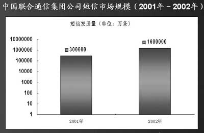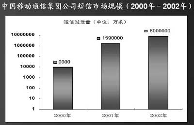“從2001年的189億條增長到2002年的超過900億條,我國短信業(yè)務的增長率是移動用戶數增長率的3.4倍。” 計世資訊分析師許牧說。