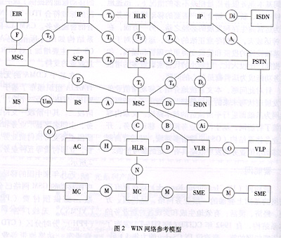 在基于CDMA的無線智能網(wǎng)方面,北美的TIA/EIA組織頒布了基于CS-2的無線智能網(wǎng)規(guī)范WIN。WIN分為三個(gè)階段:階段一、預(yù)付費(fèi)階段和階段二。其中階段一支持的主要業(yè)務(wù)有來話篩選業(yè)務(wù),主叫名字顯示業(yè)務(wù)和語音控制的業(yè)務(wù),預(yù)付費(fèi)階段主要支持預(yù)付費(fèi)業(yè)務(wù),階段二支持被叫集中付費(fèi),立即付費(fèi)等五種業(yè)務(wù)。WIN網(wǎng)絡(luò)參考模型如圖2所示。