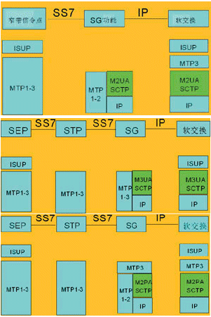 ·信令網(wǎng)關(guān)(SG)終結(jié)MTP2協(xié)議,將MTP2、MTP3之間的原語封裝為M2UA消息,在信令網(wǎng)關(guān)功能和軟交換設(shè)備間傳遞,信令網(wǎng)關(guān)與軟交換分別實現(xiàn)MTP1/2和3層功能;