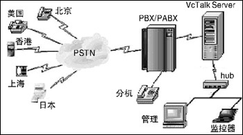 用語音板卡搭建電話會(huì)議一般注重在單一的音頻通信?紤]到單純的音頻或視頻會(huì)議模式都或多或少有各自的局限性,宇音將數(shù)據(jù)與語音整合在一起,實(shí)現(xiàn)音頻/圖文會(huì)議。VCTalk各系列電話會(huì)議系統(tǒng)采用高性能的語音/會(huì)議資源卡作為硬件支持,可實(shí)現(xiàn)多方電話會(huì)議(≥8),具有多組會(huì)議、與會(huì)者身份認(rèn)證、設(shè)置會(huì)議主持人、邀請(qǐng)與會(huì)者、會(huì)議通知、會(huì)議內(nèi)容同步播放、會(huì)議密碼保護(hù)、智能播放、會(huì)議內(nèi)容全程錄音/存儲(chǔ)、本地/遠(yuǎn)程查聽會(huì)議錄音的功能,并可以對(duì)企業(yè)內(nèi)部發(fā)生的呼叫記錄進(jìn)行計(jì)費(fèi)和統(tǒng)計(jì)。針對(duì)中小企業(yè)辦公靈活的特點(diǎn),VCTalk系統(tǒng)搭建簡單易行,其結(jié)構(gòu)圖見圖1。