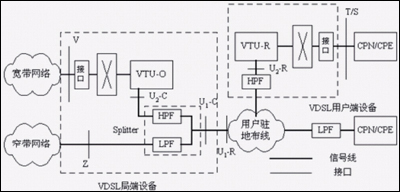 VTU-R分別是位于局端和用戶(hù)端的VDSL收發(fā)器。業(yè)務(wù)分離器(Splitter,包括HPF和LPF)將同一對(duì)電話(huà)銅纜上傳輸?shù)腣DSL與窄帶業(yè)務(wù)(或ADSL)