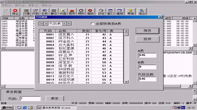 代碼編排是指用戶根據(jù)證券數(shù)據(jù)記錄在數(shù)據(jù)庫中的位置重新排定股票的索引位置,索引次序可不同于證券代碼的次序,也不是數(shù)據(jù)庫中記錄的次序,用戶可根據(jù)需要自己設定,將來發(fā)布信息時就按此索引次序(索引號)所指向的股票信息位置取信息進行發(fā)布。