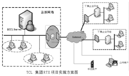 為充分發(fā)揮現(xiàn)有信息基礎(chǔ)設(shè)施和IT應(yīng)用的作用,促進(jìn)企業(yè)的實(shí)時商務(wù)運(yùn)作,節(jié)約開支,集團(tuán)公司在廣泛調(diào)查實(shí)時企業(yè)IM軟件的基礎(chǔ)上,于2002年10月對騰訊公司的RTX實(shí)時應(yīng)用軟件前身BQQ進(jìn)行了嚴(yán)格的評估和論證,認(rèn)為在如下幾個方面騰訊公司的企業(yè)IM軟件能夠解決TCL集團(tuán)公司面臨的實(shí)際問題:①業(yè)務(wù)地點(diǎn)分散,網(wǎng)絡(luò)結(jié)構(gòu)復(fù)雜;②業(yè)務(wù)復(fù)雜,無法形成集中統(tǒng)一的工作流管理系統(tǒng);③人員素質(zhì)差異性較大,復(fù)雜的IT應(yīng)用如OA系統(tǒng)等應(yīng)用推廣受到一定阻力;④集團(tuán)內(nèi)部缺乏一個公共實(shí)時交流平臺,企業(yè)內(nèi)部溝通不暢;目前集團(tuán)公司內(nèi)部主要通過電話、傳真和E_mail這些傳統(tǒng)工具傳遞信息,企業(yè)的實(shí)時化大受影響。而且騰訊公司的RTX產(chǎn)品投入低,上手快,于是TCL集團(tuán)領(lǐng)導(dǎo)決定上馬RTX項(xiàng)目,自上而下推廣RTX項(xiàng)目。