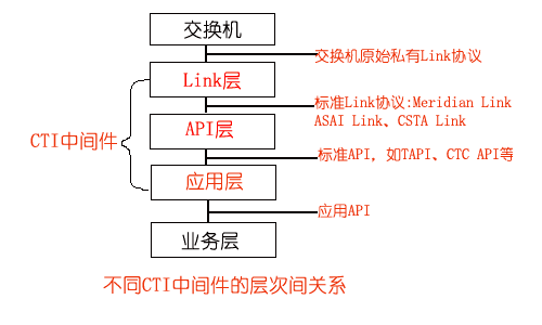 在Link層的基礎(chǔ)上,實現(xiàn)把標準Link協(xié)議轉(zhuǎn)化為標準的API,如CTC API、TAPI、JTAPI等,為CTI應(yīng)用開發(fā)提供一套標準的API,屏蔽了不同交換機擁有的CTI協(xié)議和CTI接口,使應(yīng)用程序員無需關(guān)心消息是如何在計算機和交換機之間傳遞,專注于客戶端的應(yīng)用開發(fā),實現(xiàn)應(yīng)用程序與交換機平臺無關(guān)性。