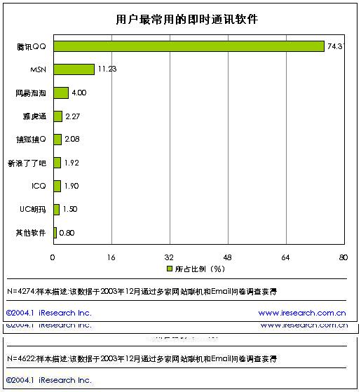 根據(jù)不完全統(tǒng)計,2003年中國即時通訊軟件的最高在線人數(shù)已經(jīng)突破了550萬人。其中,QQ、MSN Messenger、網(wǎng)易泡泡、UC朗瑪這四個即時通訊軟件占據(jù)了市場的絕大部分份額。