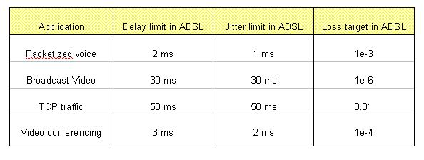 本節(jié)以ADSL承載的幾種典型業(yè)務為例,討論如何保證不同應用的QoS要求。為保證不同應用的QoS要求,ADSL設備可通過對不同的業(yè)務進行分級,以Diffserv的方式提供不同的分級所需的QoS質量。例如可將語音業(yè)務(VoIP)和視頻會議設為最高優(yōu)先級,廣播視頻業(yè)務設為較高優(yōu)先級,其他如Web瀏覽等業(yè)務設為低優(yōu)先級。ADSL設備為每個優(yōu)先級設立獨立的隊列,然后采用嚴格優(yōu)先級或帶有權重的循環(huán)機制控制各優(yōu)先級隊列的輸出。通過調(diào)整不同優(yōu)先級隊列的buffer大小和最長留駐時間,可滿足不同應用對時延、抖動、包丟失率的不同要求。