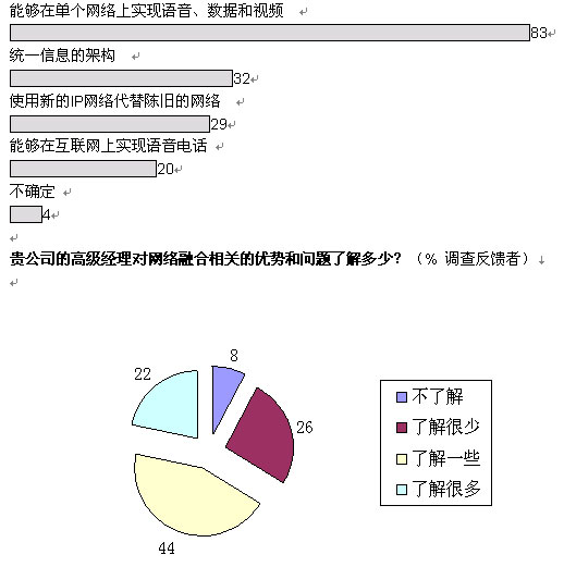 從更為廣泛的層面上看,我們的調查結果顯示:三分之一的管理人員對融合網(wǎng)絡的益處一無所知或者知之甚少。困惑的并不僅是高級經(jīng)理們:分析公司IDC近期對歐洲600余名廣域網(wǎng)管理人員進行的調查顯示,只有五分之一的人能夠完全了解融合網(wǎng)絡所實現(xiàn)的各項功能。
