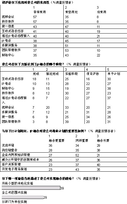 不久以前,“融合”這個詞給人的感覺是過分追捧技術和超前于時代的概念。此后不久,傳輸數(shù)據(jù)、語音和視頻的網(wǎng)絡融合逐漸成為現(xiàn)實。根據(jù)對103位高級經(jīng)理的調查結果表明,三分之二的企業(yè)正計劃在今后五年內將其覆蓋整個企業(yè)的應用轉型為統(tǒng)一的IP網(wǎng)絡。四分之一的調查反饋者認為這對實現(xiàn)其企業(yè)戰(zhàn)略“尤為重要”。