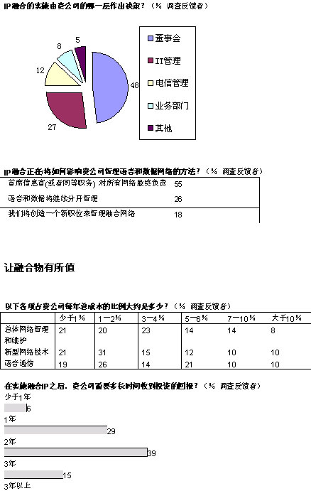 …..但是耐心等待回報是一種美德IP融合的投資回報的確令人期待,但是公司經(jīng)理們似乎并不急于馬上付諸實施。此前出現(xiàn)的“成長”技術,例如自動客戶關系管理(CRM)或者無線本地局域網(wǎng)(WiFi),通常只在幾個月時間里勉強維持,但是我們的調查參與者似乎眼光更加長遠。絕大部分人準備好了等待一年以上的時間,約40%的人準備好等待兩年多甚至三年或者更長的時間。