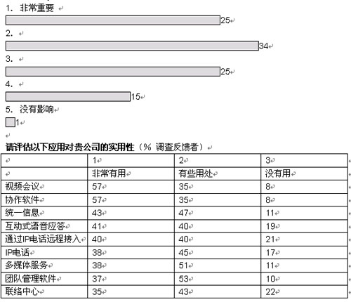 我們調查的企業(yè)中,有超過三分之二將在未來五年內實現(xiàn)大多數(shù)或者所有部門向融合網(wǎng)絡的轉型。大部分企業(yè)采取按部就班的形式在某些特殊部門和業(yè)務開始部署。在融合應用中,IP語音電話將在未來三年內吸引大量投資;管理人士期望通過大幅削減公司內部的通話費用獲得早期的回報。在更廣泛的層面上,大多數(shù)管理者預計,融合網(wǎng)絡對其企業(yè)的商業(yè)影響將會“非常重要”或者“重要”。