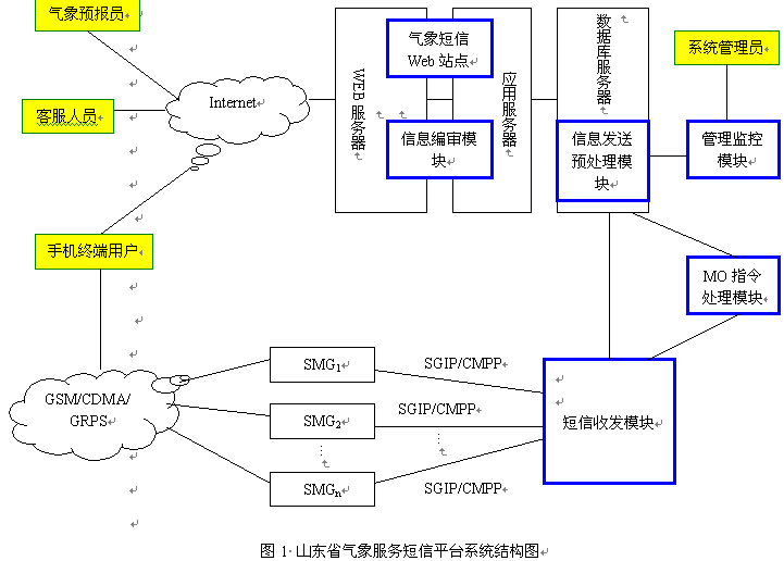 山東省氣象臺(tái)為實(shí)現(xiàn)“1210手機(jī)氣象站”服務(wù),通過(guò)技術(shù)合作的方式建設(shè)了山東省氣象服務(wù)短信平臺(tái)。該平臺(tái)采用操作系統(tǒng)無(wú)關(guān)、開(kāi)放性好的J2EE軟件架構(gòu),數(shù)據(jù)庫(kù)選用處理能力強(qiáng)、穩(wěn)定性好的Oracle9i大型數(shù)據(jù)庫(kù)系統(tǒng),該平臺(tái)目前正在為全省50萬(wàn)用戶(hù)每天通過(guò)短消息提供各種天氣預(yù)報(bào)服務(wù)。下面將主要介紹氣象短信平臺(tái)的系統(tǒng)結(jié)構(gòu)、各模塊功能和系統(tǒng)特點(diǎn)。