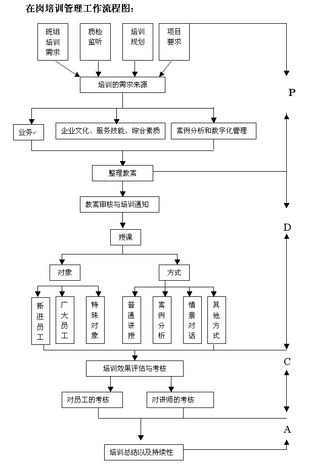 整個(gè)在崗培訓(xùn)管理工作流程一般以一個(gè)月為一個(gè)短周期,半年或一年為長(zhǎng)周期制定工作計(jì)劃,其中,短周期的培訓(xùn)中,以常規(guī)培訓(xùn)和突擊培訓(xùn)為主,集中提升員工的應(yīng)答技能,長(zhǎng)周期的培訓(xùn),常常要完成項(xiàng)目規(guī)劃的培訓(xùn)內(nèi)容和專項(xiàng)培訓(xùn),重點(diǎn)提升員工的綜合素養(yǎng)。